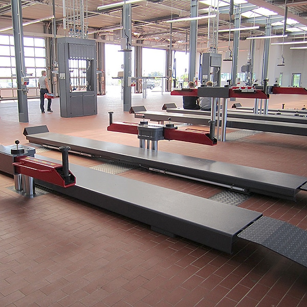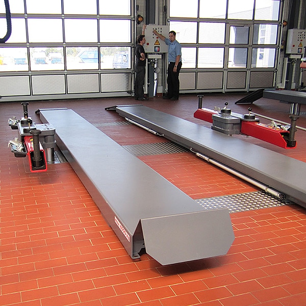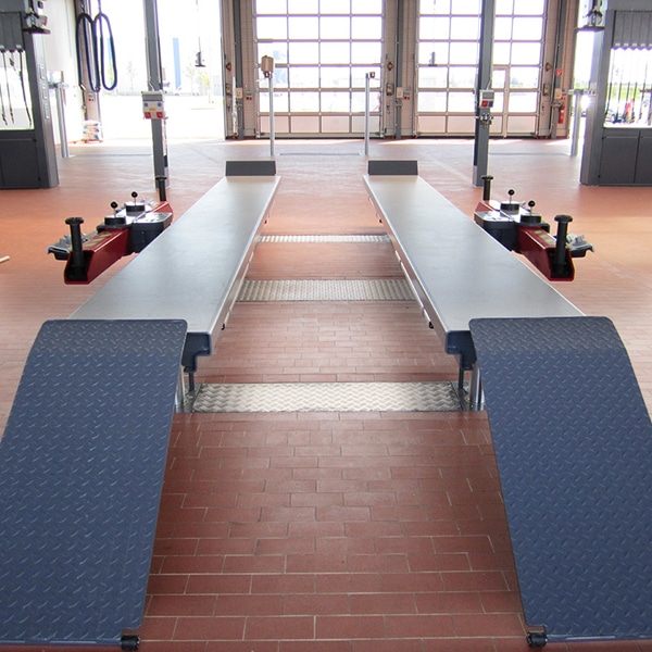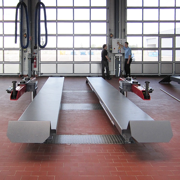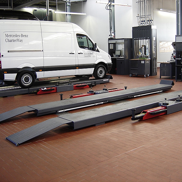 The 5,500 mm long drive-on rails with a load capacity of 6,500 kg are suitable for lifting vehicles by their wheels.