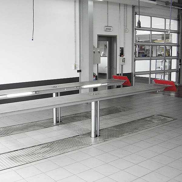 With the drive-up rails, this 2-ram lift enables problem-free lifting of everything from small cars to vans and transporters. Due to the favorable angle of the drive-up ramps, lowered vehicles or vehicles with sport chassis can even be lifted with drive-up rails resting on the ground.