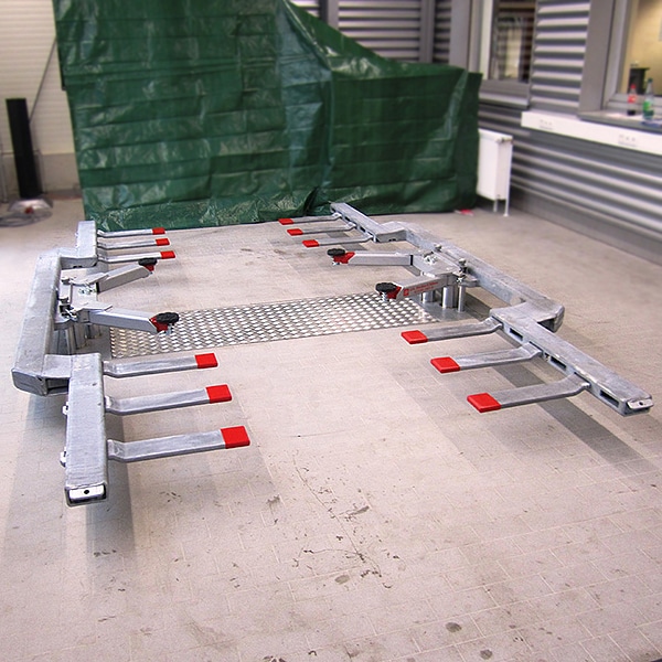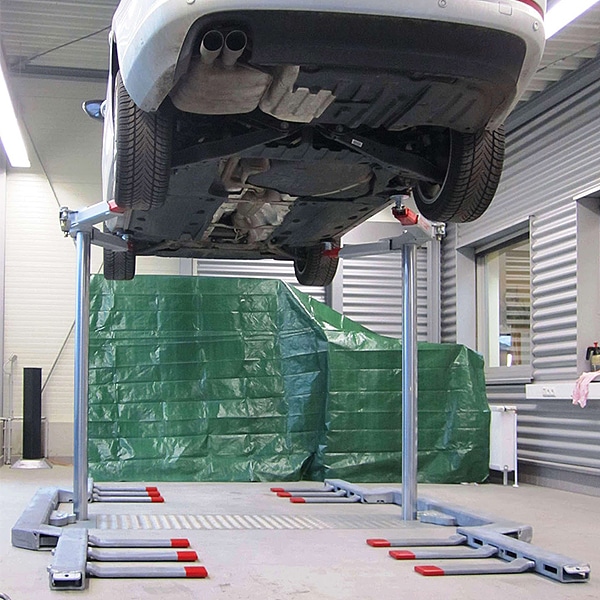 Due to the extremely flat spring leaves (20 mm drive-up height) of the “Essmann” drive-up ramp, recessed installation of the lift is not necessary. This means that the TwinRam 35 AE-S2 can also be used to easily lift vehicles with sports chassis.