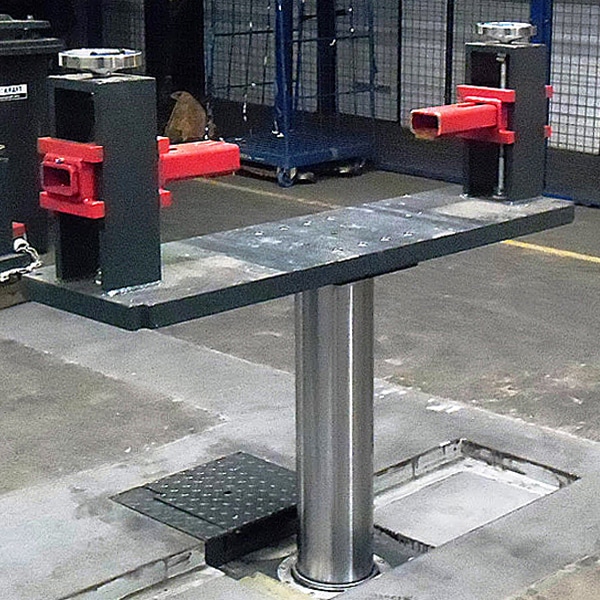 Hydraulische Hubeinheit mit integriertem Hydraulikaggregat. Der Einbau erfolgt in einen feuerverzinkten Fundamentrahmen, die Lastaufnahmemittel sind bodeneben versenkt.