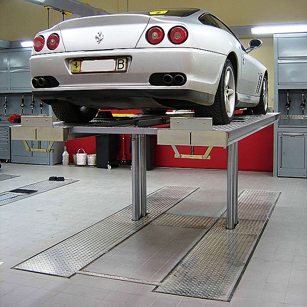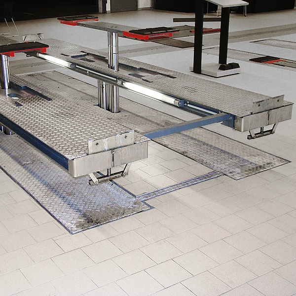 Versenkte Auffahrschienen dieser 2-Stempel-Hebebühne und ein in den Auffahrschienen versenkter Nachhub ermöglichen die problemlose Aufnahme der Fahrzeuge.